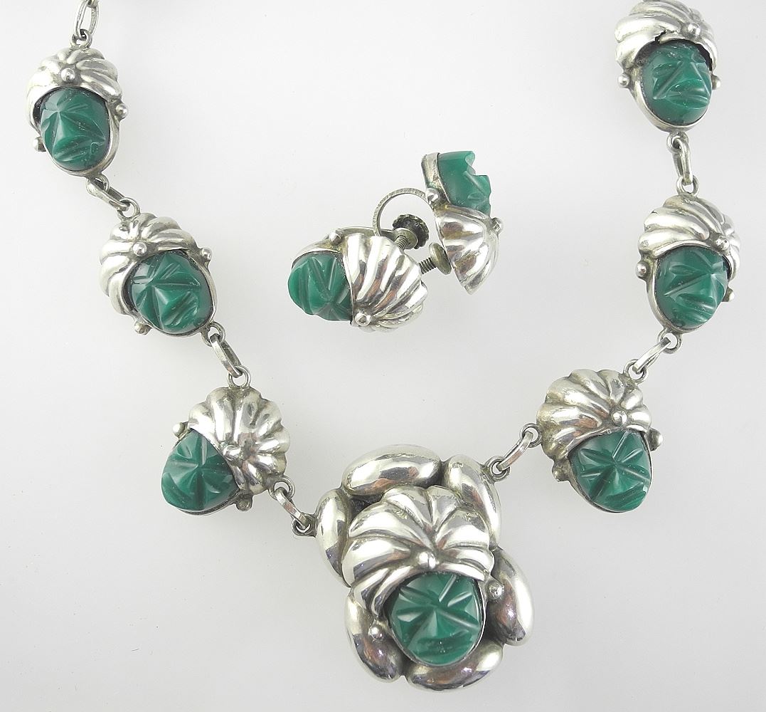 Mid Century Iguala Mexican 925 Silver Green Onyx Tribal Necklace/ Earrings, 45g.