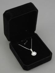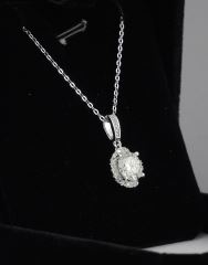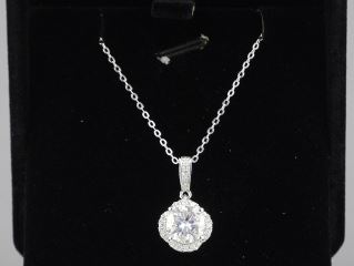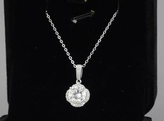 LOT 210 2ct Moissanite Wave Halo Necklace, 15-16"L, Sterling Silver with White Gold Overlay with COA. Estimate: $50 - $100 Sold For: $25 Auction Date: Tuesday, June 10 2025 at 4:00 PM