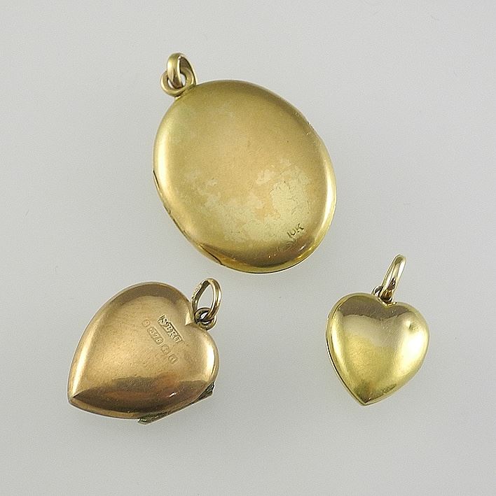 Three Gold Lockets: 1 1/4" 10K / 7/8" 9K / 5/8" 15K (each marked), TW 12.7g.