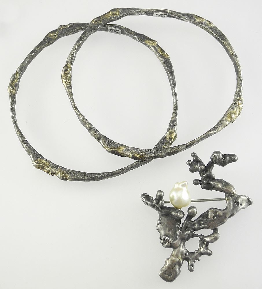 LOT 82 Collection of Silver & Gold (tested & marked) Modernist Jewelry: Cuff/ Two Bangles/Pearl Brooch, Estimate: $200 - $300 Auction Date: Tuesday, June 10 2025 at 4:00 PM