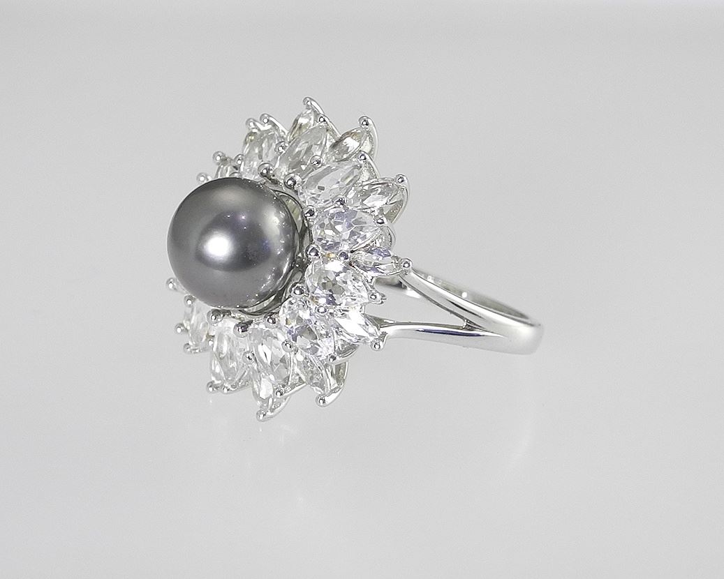 Sterling (marked 925) Silver Tahitian Pearl & White Topaz Ring, Size 9, 6.7g.