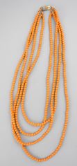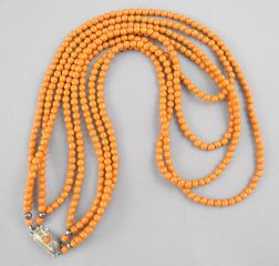 Double Double Strand of Coral Glass Beads with 835 Silver Clasp, 18"L.