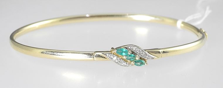 LOT 121 10K (marked) Yellow Gold Emerald & Diamond Hinged Bracelet, 2 3/4"w, 4.8g. Estimate: $160 - $220 Sold For: $200 Auction Date: Tuesday, June 10 2025 at 4:00 PM