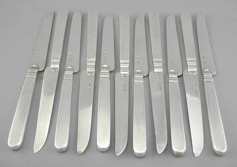 LOT 74 Set of Eleven Continental Silver Bladed Knives, 488g. Estimate: $250 - $350 Sold For: $425 Auction Date: Tuesday, June 10 2025 at 4:00 PM
