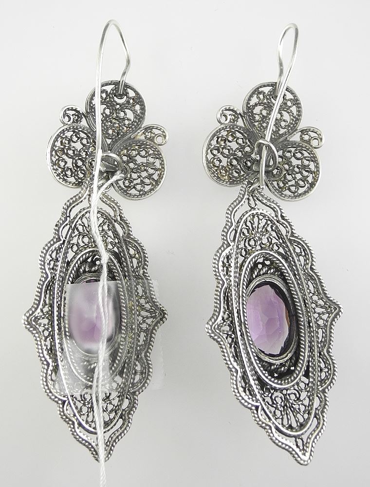 LOT 267 Pair of Sterling (tested) Silver & Amethyst Pendant Earrings, 3"h, 21.1g. Estimate: $60 - $100 Sold For: $100 Auction Date: Tuesday, June 10 2025 at 4:00 PM