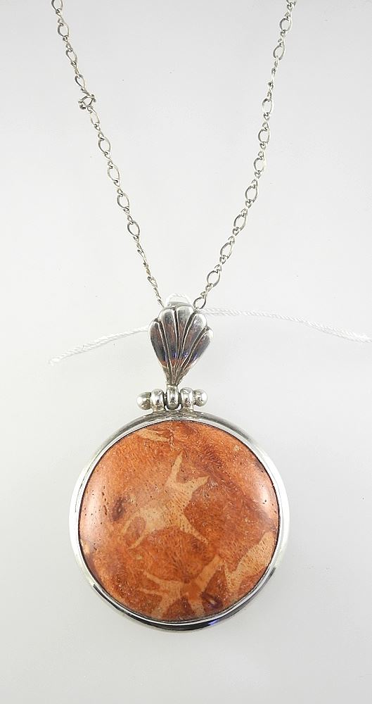Vintage Navajo Sterling Silver (925) & Sponge Red Coral Pendant on Plated Chain, 17"L.