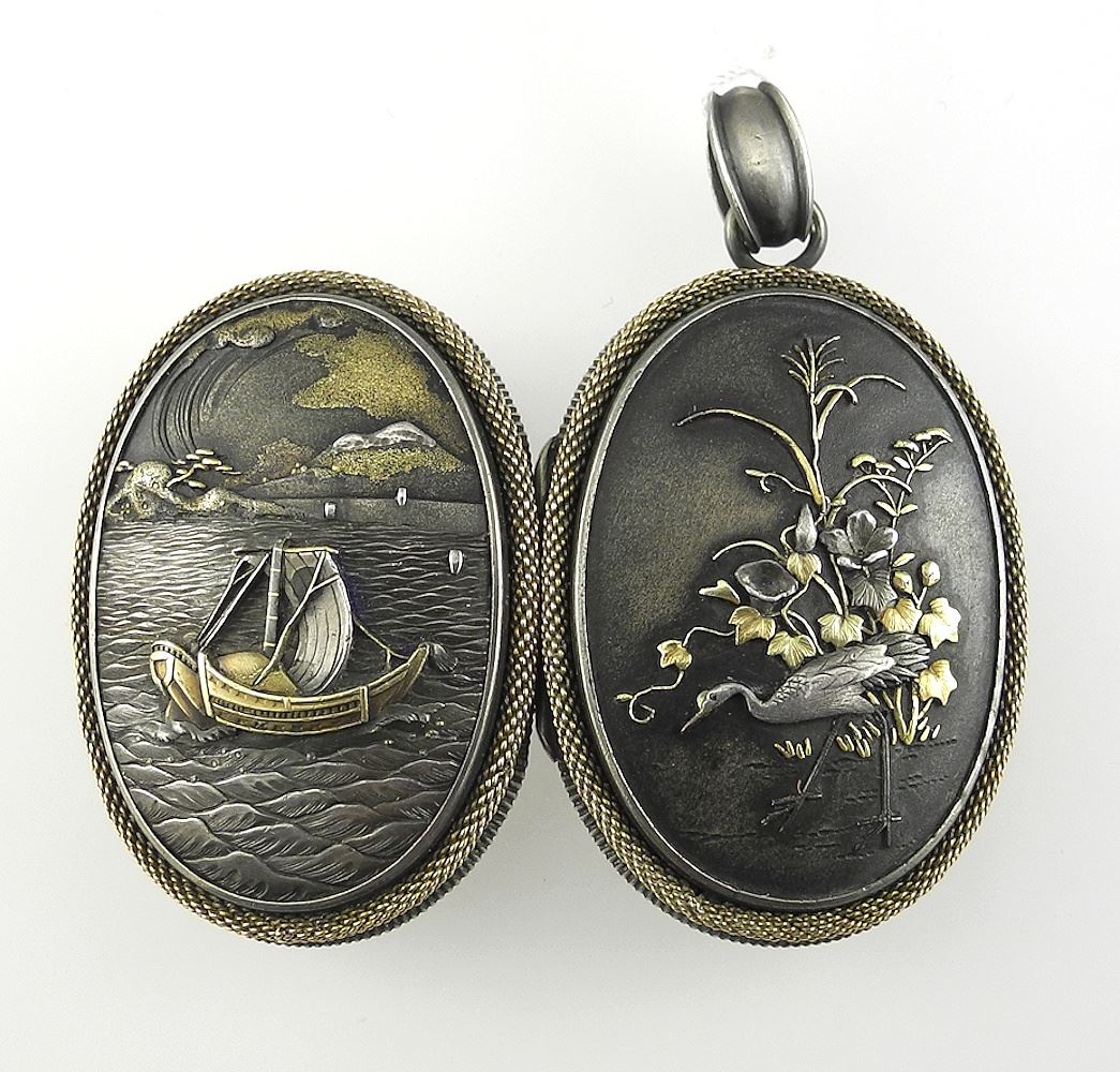 Japanese Shakudo Locket with Gold & Silver Overlay, 1 1/2"h, 32g.