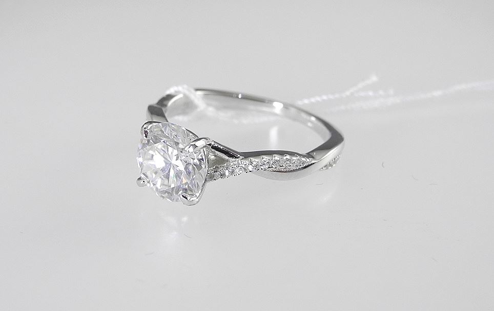 2CT Moissanite Twist Ring, Size 8, Sterling with White Gold Overlay with Report.
