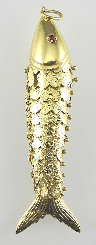 14K Articulated Fish Pendant with Ruby Eyes, 3", 8.7g.