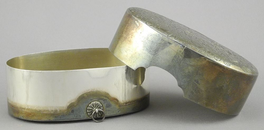 LOT 337 Asian Oval Box Marked Silver, 3 3/8"w, 122g. Estimate: $150 - $200 Sold For: $325 Auction Date: Tuesday, October 28 2025 at 4:00 PM