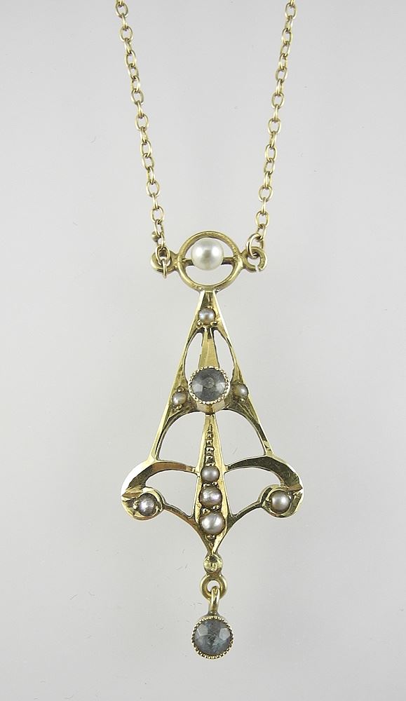 Edwardian 14K (marked) Gold Aquamarine & Seed Pearl Necklace, 15"L, 2.2g.
