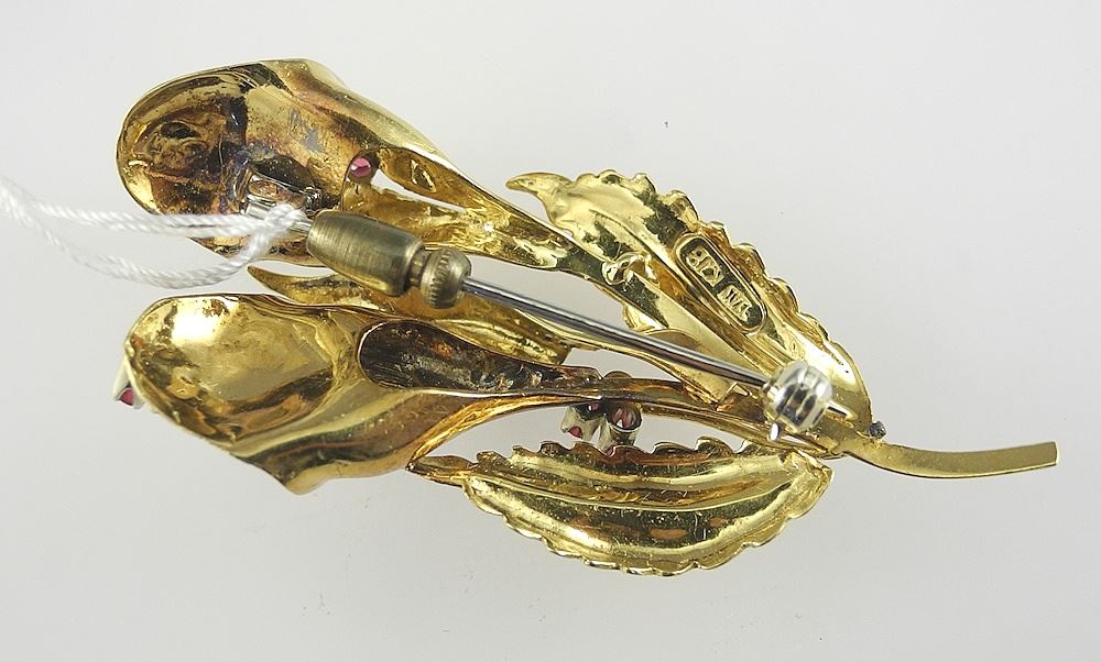 LOT 74 Italian 18K (marked K18) Gold & Ruby Brooch, 2 1/4"h, 11.7g. Estimate: $800 - $1,400 Sold For: $800 Auction Date: Tuesday, October 28 2025 at 4:00 PM
