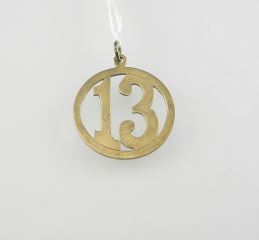 LOT 134 14K (marked) Gold "Lucky 13" Pendant, 7/8" Diameter, 2.3g. Estimate: $160 - $240 Sold For: $180 Auction Date: Tuesday, October 28 2025 at 4:00 PM