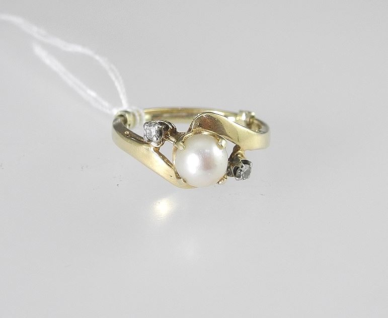 14K (marked) Gold Pearl & Diamond Ring, Sized to 3 3/4, 2.2g.