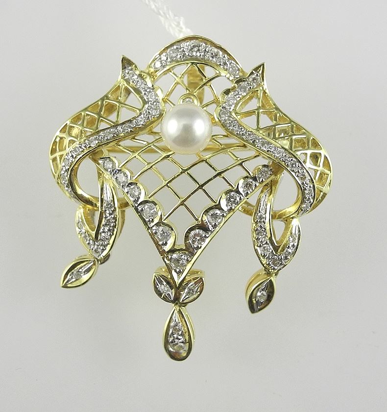 18K (marked 750) Gold Diamond & Pearl Brooch/Pendant; 30MMh, 6.0g.