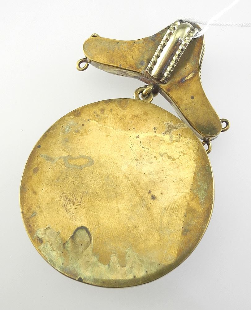 LOT 322 Tibetan/Nepalese Brass Coral & Turquoise Gau Pendant with Linen Pouch, 2 3/4"h, 31.7g. Estimate: $60 - $100 Sold For: $50 Auction Date: Tuesday, October 28 2025 at 4:00 PM