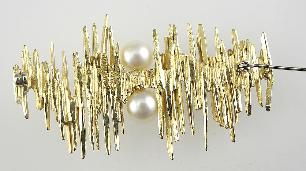 LOT 87 Modernist 18K (marked) Gold & Pearl Brooch & Earrings, 2 1/4"w, TW 22g. Estimate: $1,500 - $2,250 Sold For: $1,900 Auction Date: Tuesday, October 28 2025 at 4:00 PM