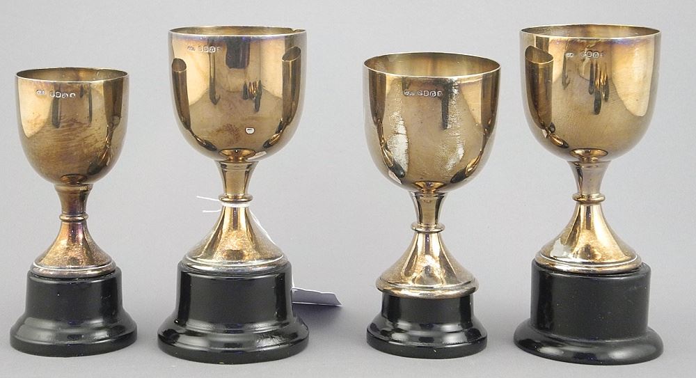LOT 304 Seven Hallmarked Silver Trophy Cups, 2 7/8 - 3 1/2"h, 238g Weighable. Estimate: $250 - $350 Sold For: $250 Auction Date: Tuesday, October 28 2025 at 4:00 PM