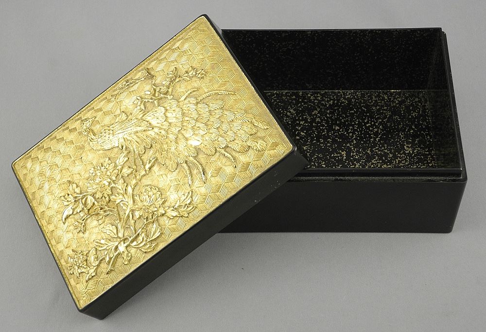 LOT 124 Chinese & Embossed Gilded Black Lacquer Peacock Box, 3 x 5 1/2 x 4 1/8". Estimate: $60 - $80 Sold For: $50 Auction Date: Tuesday, October 28 2025 at 4:00 PM