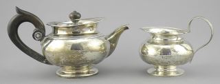 LOT 43 Dutch Silver (marked) Teapot (7 1/2"L) & Cream Jug, TW 421g. Estimate: $500 - $750 Sold For: $750 Auction Date: Tuesday, February 03 2026 at 4:00 PM