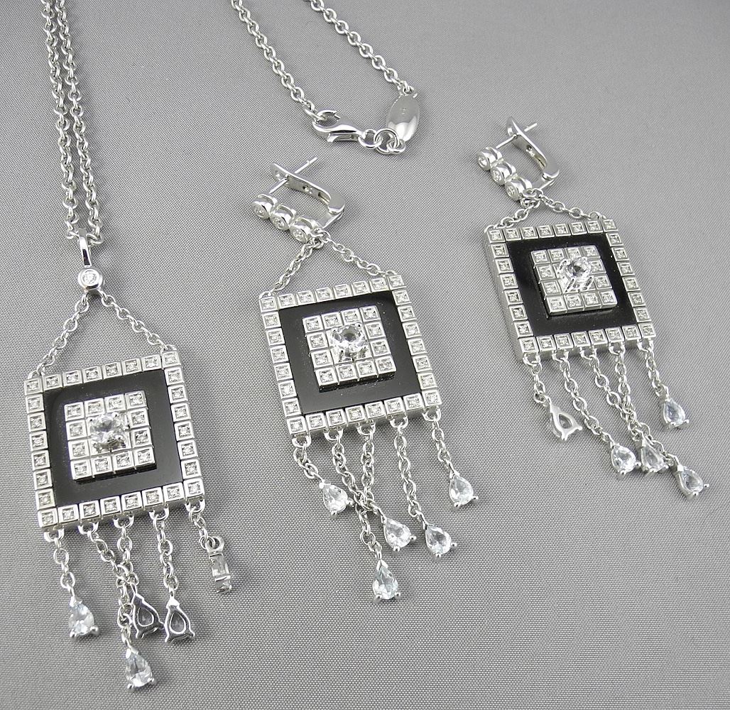 Pair of Badgley Mischka 18K (tested) White Gold Aquamarine Onyx & Diamond Earrings & Pendant, 29.5g