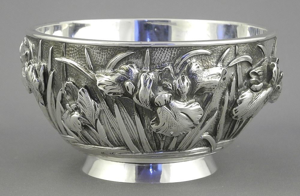 Japanese Export Silver "Irises" Bowl, Base Marked, 2 3/4 x 4 3/4" Diameter, 216.5g.