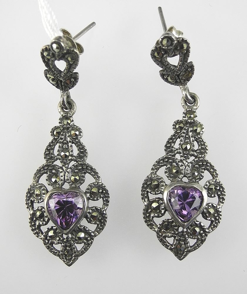 LOT 74 Pair of Sterling Silver (925) Heart Shaped Amethyst & Marcasite Earrings Estimate: $60 - $100 Sold For: $70 Auction Date: Tuesday, February 03 2026 at 4:00 PM