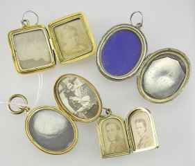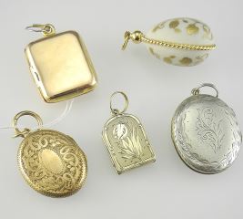 LOT 86 Collection of Gold Tone & Silver Coloured Lockets (4 pcs) & Droplet, 7/8 - 1 3/8"h. Estimate: $80 - $140 Sold For: $275 Auction Date: Tuesday, February 03 2026 at 4:00 PM