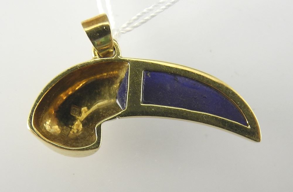 LOT 34 18K (marked 750) Gold Toucan Pendant w/ Blue Stone Beak, 2.3g. Estimate: $200 - $300 Sold For: $150 Auction Date: Tuesday, February 03 2026 at 4:00 PM