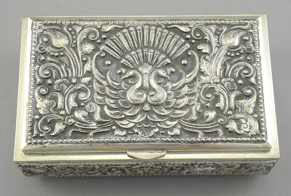 Indian .800 Silver Cigarette Box, 2 1/4 x 6 1/4 x 3 7/8", 475g. Base Marked