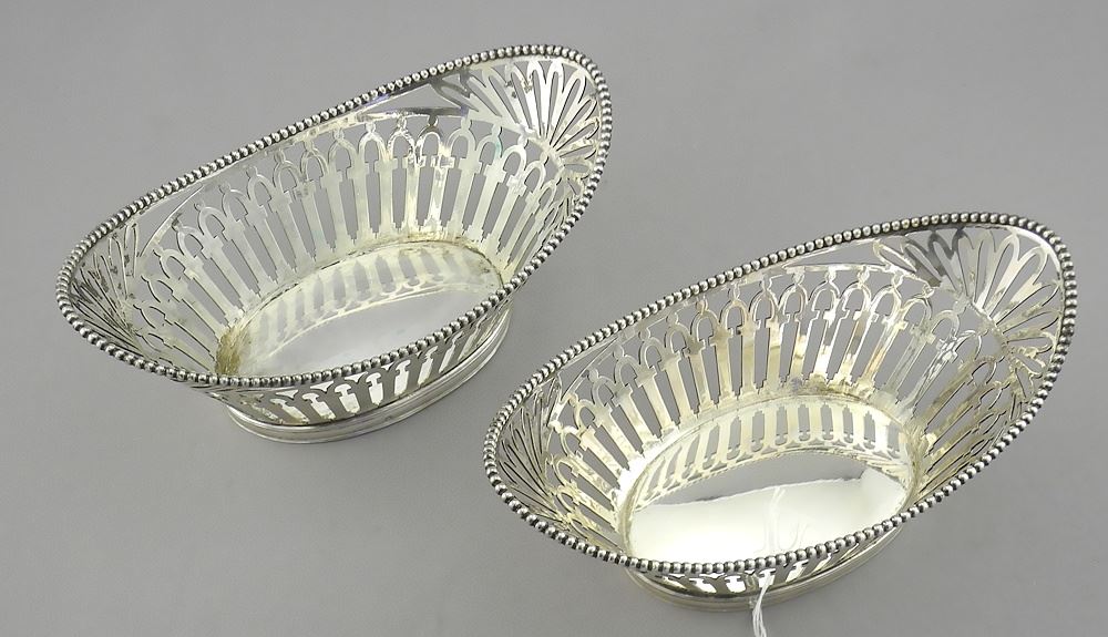 LOT 7 Pair of Dutch Silver (marked) Baskets, 6 1/4"w, 266g. Estimate: $300 - $500 Sold For: $450 Auction Date: Tuesday, February 03 2026 at 4:00 PM