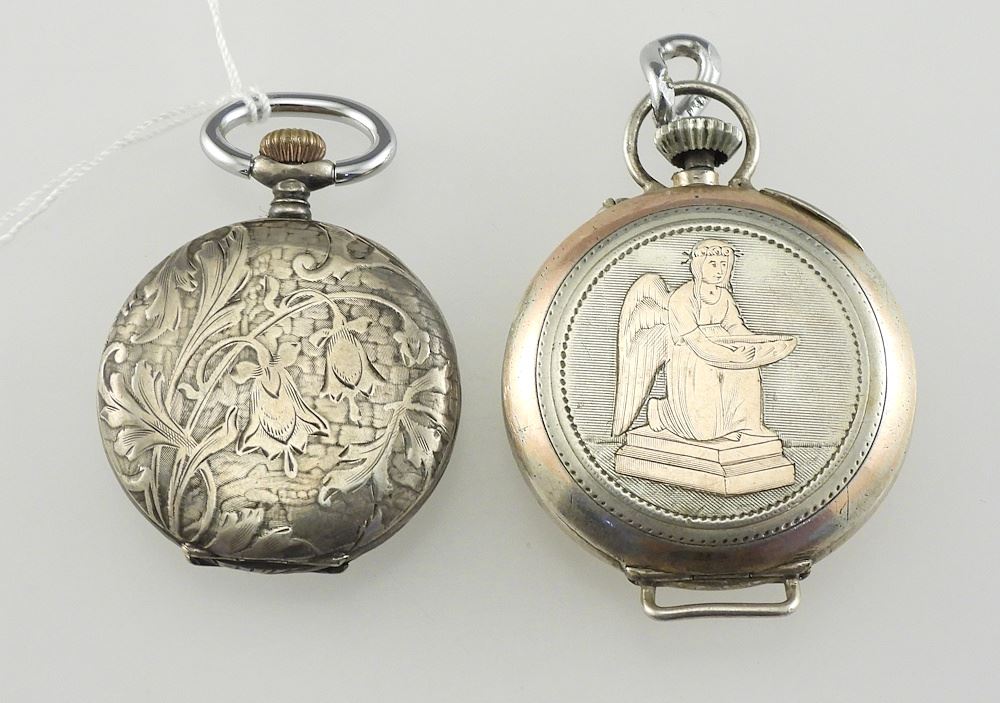 Two Ladies Silver Pocket Watches: Revival 900 (20g) & .800, 28.5g.