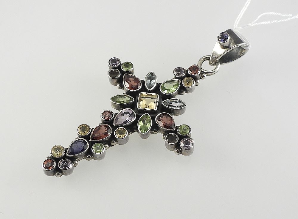LOT 331 Sterling Silver (925) Multi Gemstone Cross, 2 1/4"h, 11.9g. Estimate: $60 - $100 Auction Date: Tuesday, April 14 2026 at 4:00 PM