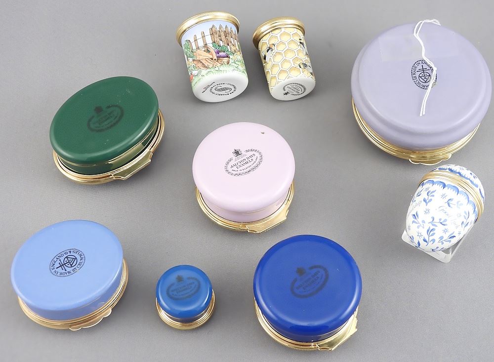 LOT 83 Collection of Nine Halcyon Days & Other Enamel Boxes, Largest 2 1/4". Estimate: $100 - $140 Sold For: $160 Auction Date: Tuesday, April 14 2026 at 4:00 PM