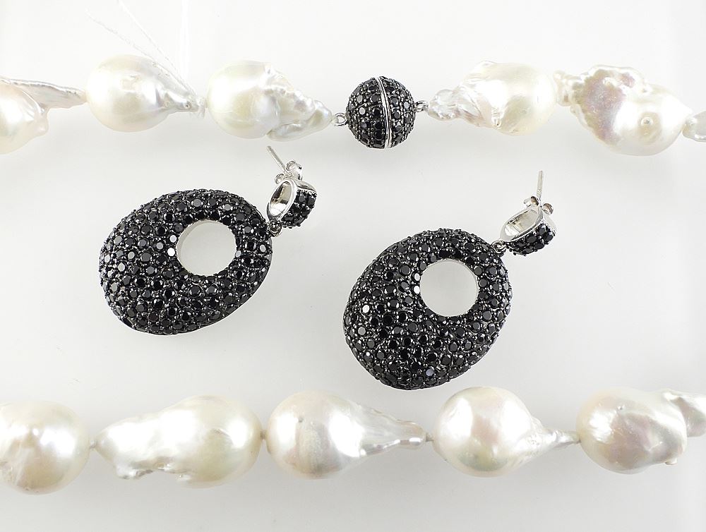 Baroque Freshwater Pearl Necklace with Black Spinel Clasp & Earrings.