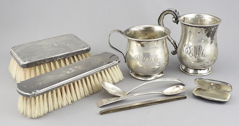 Collection of Sterling Silver Christening Mugs, Napkin Rings, Nut Dishes (380g) & 17 Brushes