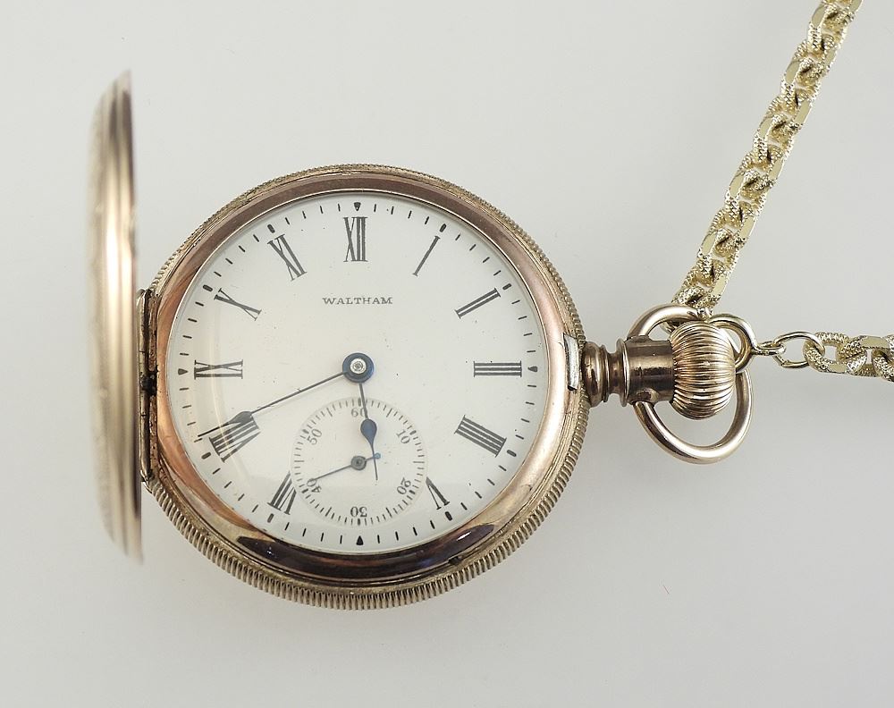 LOT 143 Waltham Pocket Watch (1 5/8" Diam., Approx. 52g) on Gold Plate Chain, 23"L (inscribed Gertie). Estimate: $100 - $150 Sold For: $130 Auction Date: Tuesday, April 14 2026 at 4:00 PM