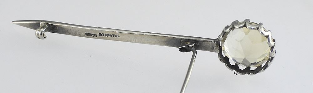 LOT 165 Scottish Sterling (marked) Silver & Cairngorm Kilt Pin with Black Pouch, 3 1/8", 6.4g. Estimate: $60 - $100 Sold For: $30 Auction Date: Tuesday, April 14 2026 at 4:00 PM