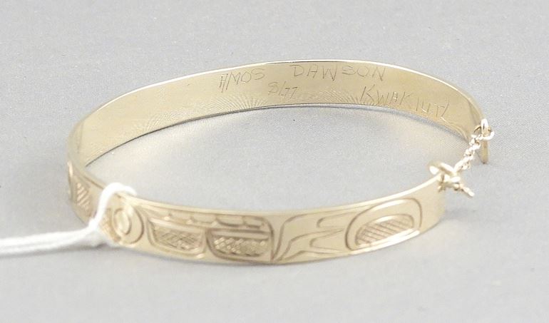 LOT 15 Kwagiulth 14K (clasp marked) Gold Bracelet signed Amos Dawson 8/77, 1/4 x 2 1/4", 7.7g. Estimate: $750 - $950 Sold For: $750 Auction Date: Tuesday, April 14 2026 at 4:00 PM