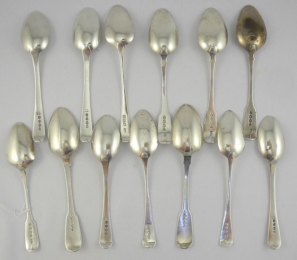 LOT 209 Collection of Thirteen Various Georgian Hallmarked Silver Tea Spoons, 5 1/4"L, 200g. Estimate: $400 - $500 Sold For: $400 Auction Date: Tuesday, April 14 2026 at 4:00 PM