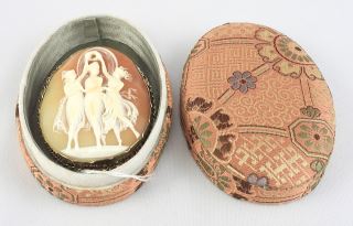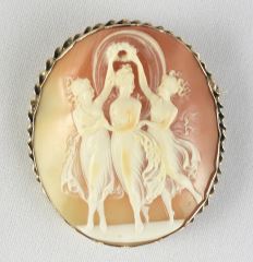 LOT 304 19th C. "Three Graces" Cameo Brooch in 9c (tested) Frame, 2"h, 17g. Estimate: $100 - $200 Sold For: $350 Auction Date: Tuesday, April 14 2026 at 4:00 PM