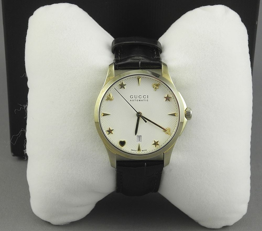LOT 276 Gucci G-Timeless Automatic Wristwatch, 16687354 with Original Box & Warranty. Estimate: $800 - $1,000 Sold For: $700 Auction Date: Tuesday, April 14 2026 at 4:00 PM