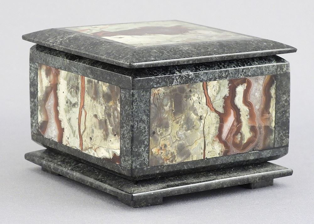 LOT 285 Magadan Siberia Semi-Precious Specimen Stone Box, 2 1/8 x 2 7/8 x 2 7/8". Estimate: $80 - $100 Sold For: $90 Auction Date: Tuesday, April 14 2026 at 4:00 PM