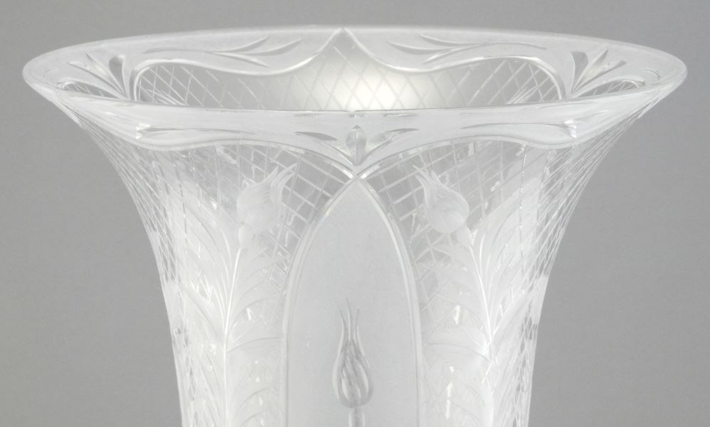 Glass Trumpet Shaped Vase with Cut Flower & Lattice Design, 16"h.