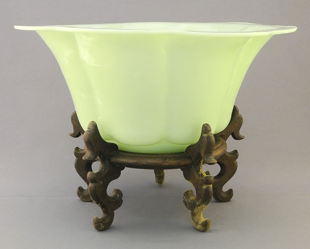 LOT 156 Obed Celadon Green Glass Bowl (5" x 16 1/8" Diam.) with Wood Stand, 4 1/4"h. Estimate: $200 - $400 Sold For: $850 Auction Date: Tuesday, October 08 2024 at 4:00 PM