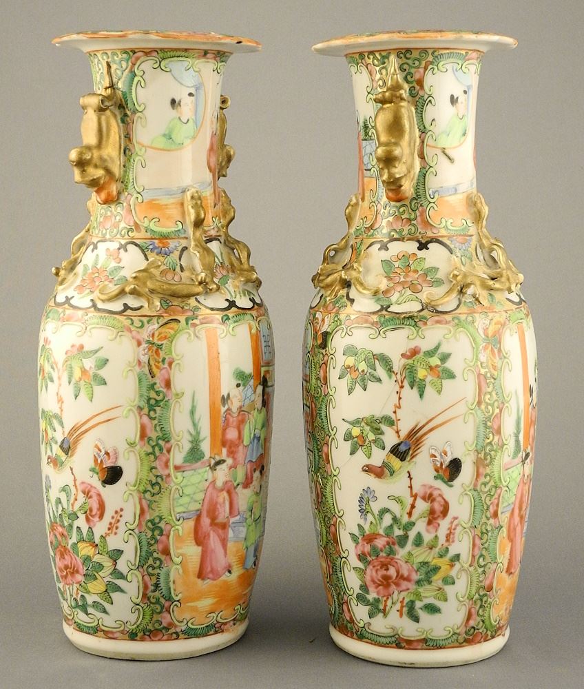 Pair of Chinese Rose Mandarin Porcelain Vases, 10 1/4"h (one cracked).