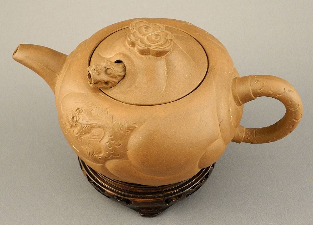 LOT 184 Chinese Yixing Ware Teapot with signed Captive Dragon Cover (7 7/8" L) with Stand. Estimate: $100 - $200 Sold For: $90 Auction Date: Tuesday, October 08 2024 at 4:00 PM