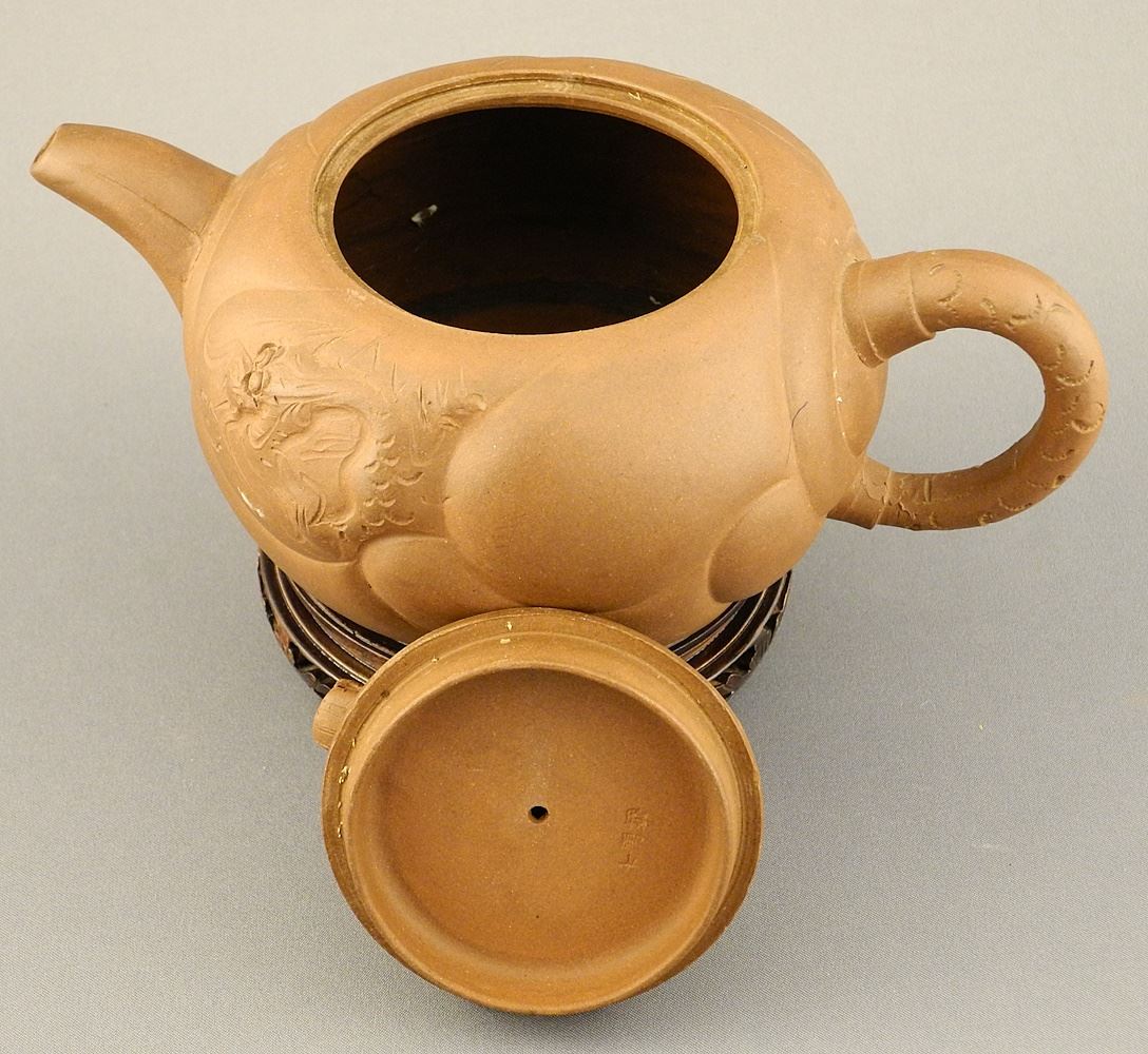 LOT 184 Chinese Yixing Ware Teapot with signed Captive Dragon Cover (7 7/8" L) with Stand. Estimate: $100 - $200 Sold For: $90 Auction Date: Tuesday, October 08 2024 at 4:00 PM