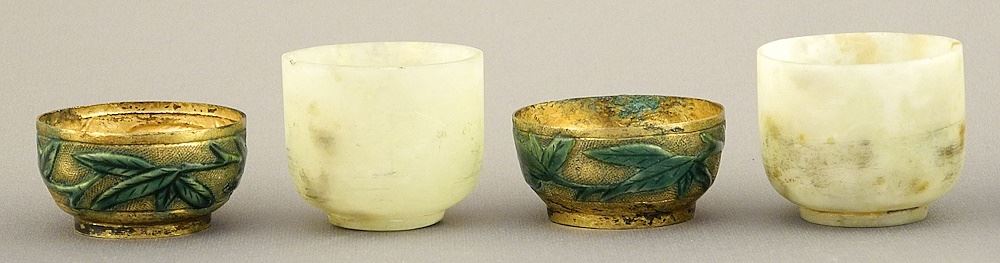 LOT 186 4 Chinese Enameled Gilt Metal & Soft Stone Wine Cups, 1"h. Estimate: $100 - $200 Sold For: $90 Auction Date: Tuesday, October 08 2024 at 4:00 PM