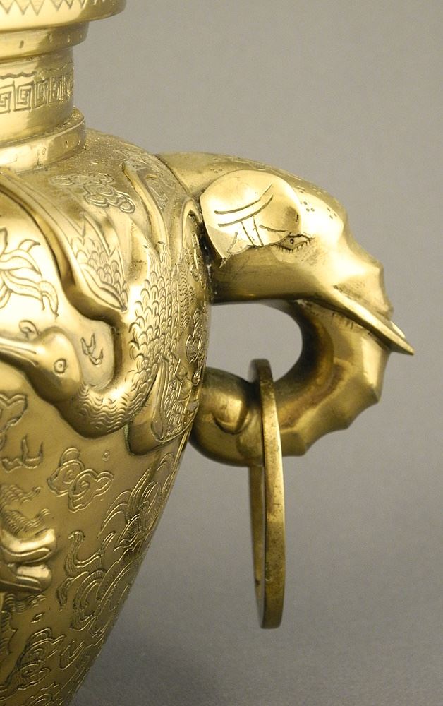 LOT 69 Heavy Cast Brass Chinese Incense Burner Surmounted by a Kylin, 11 3/4" (2 ears damaged). Estimate: $300 - $500 Sold For: $225 Auction Date: Tuesday, October 08 2024 at 4:00 PM